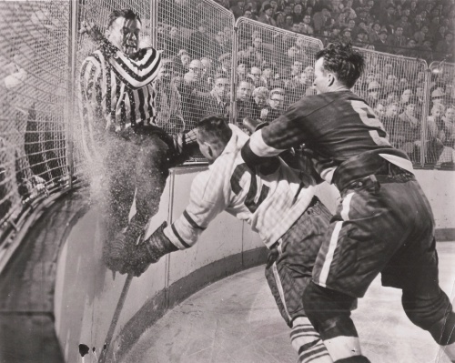 Colis finishes his check, but receives an interference penalty. The referee cringes in anticipation of receiving the dreaded “header to the nards”